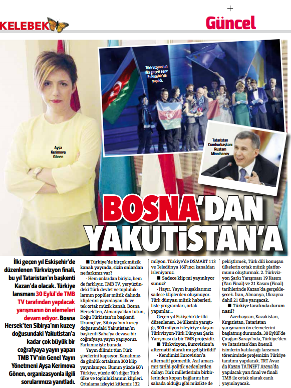 TMB TV Genel Yayın Yönetmeni Ayşa Kerimova Gönen, Türkvizyon Şarkı Yarışması’yla ilgili olarak Türkiye’nin en yüksek tirajlı gazetelerinden Hürriyet’e röportaj verdi. Gazetenin “Kelebek” ekinde yayımlanan röportajda Gönen, TMB TV ve Türkvizyon Şarkı Yarışması hakkında bilgiler verdi. TMB TV Genel Yayın Yönetmeni Ayşa Kerimova Gönen’in Türkvizyon için verdiği röportaj bugün Hürrriyet’in Kelebek ekinde yayımlandı.