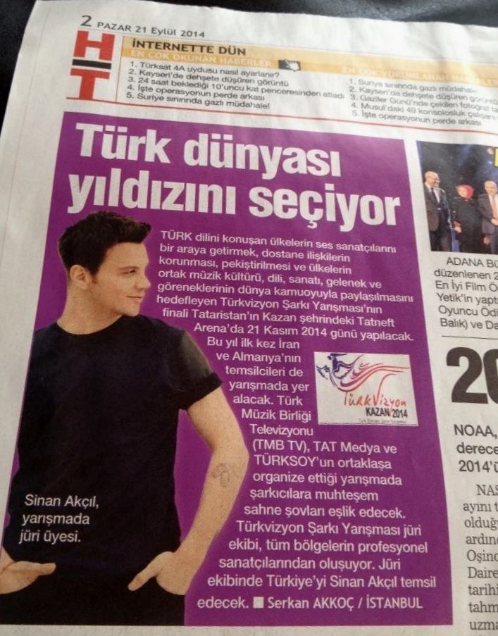 Türkvizyon Şarkı Yarışması’na basın tarafından gösterilen yoğun ilgi devam ediyor. Son olarak, geçtiğimiz gün (21.09.2014) Türkiye’nin yüksek tirajlı gazetelerinden Habertürk, Türkvizyon jürisi Sinan Akçıl ile ilgili bir habere yer verdi.